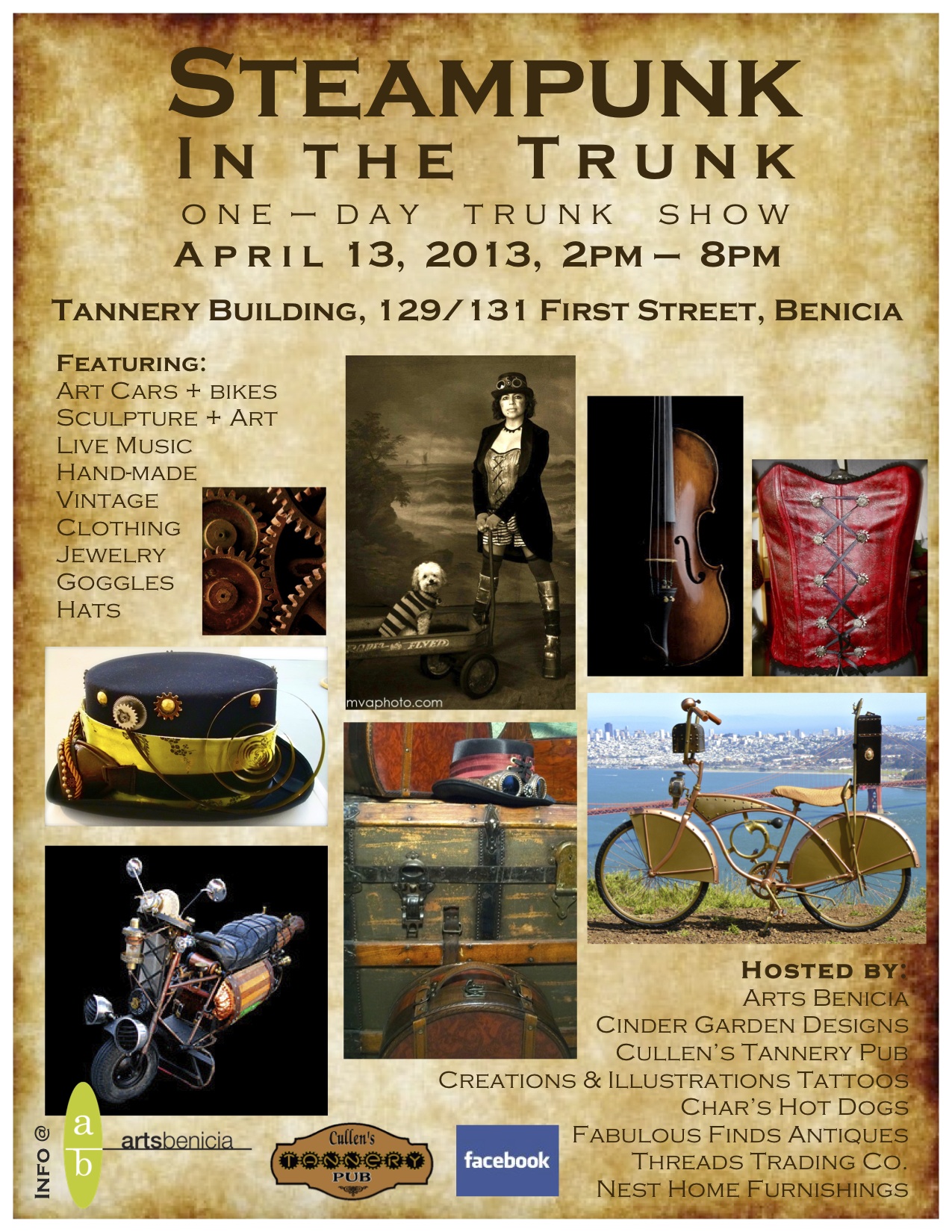 The show is on! I’m excited to be introducing Steampunk to Benicia. The response from local artists has been amazing. We will have some amazing Steampunk art cars, bikes and scooters…. plus artwork and sculpture.