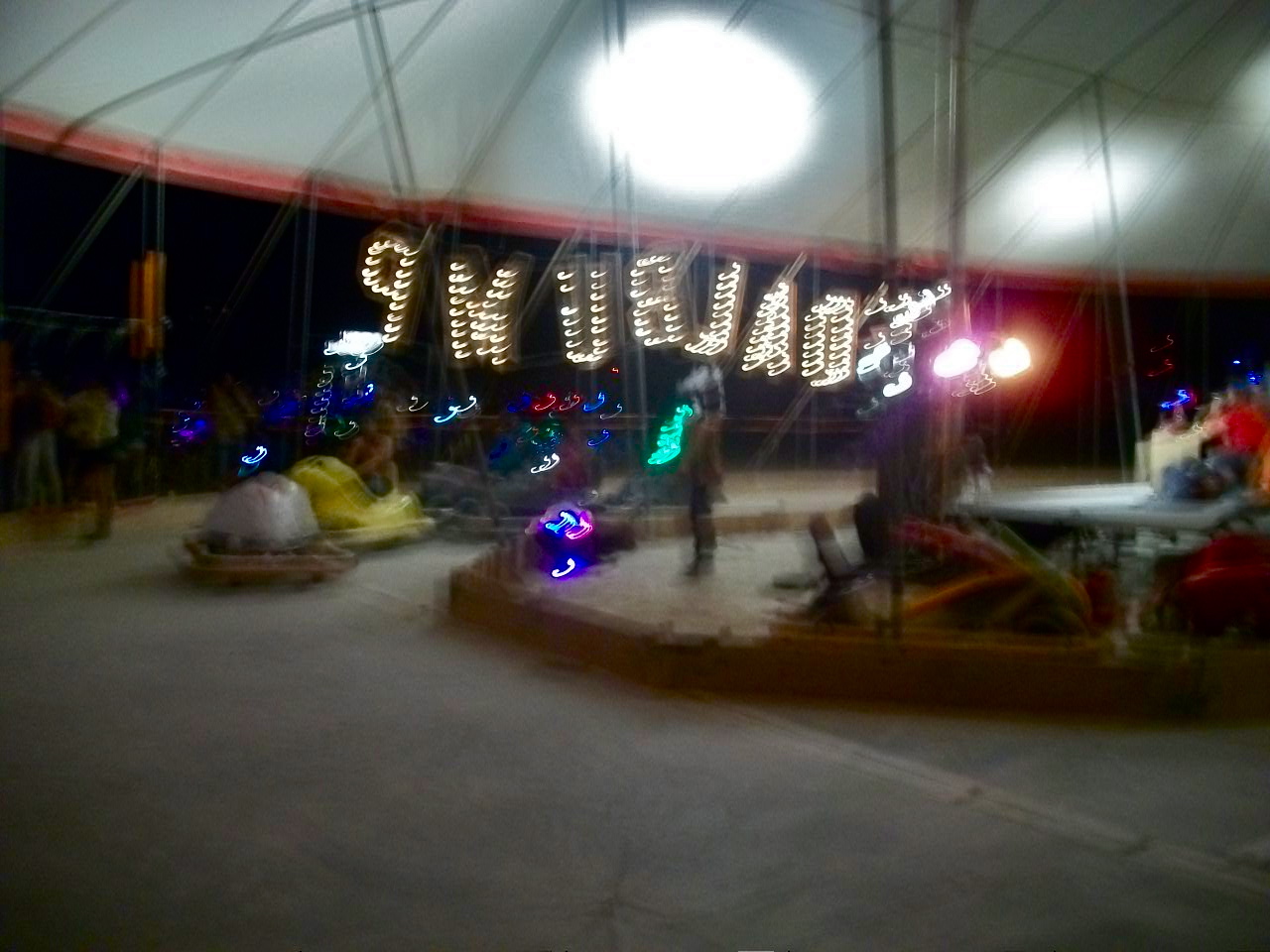 Center Camp had been our fallback for quick convenient entertainment, so we headed over to “see what was on TV”. I had a coffee-token so it was another excuse to go. Last year we danced to an awesome live funk band there, then stumbled home to our camp close-by.