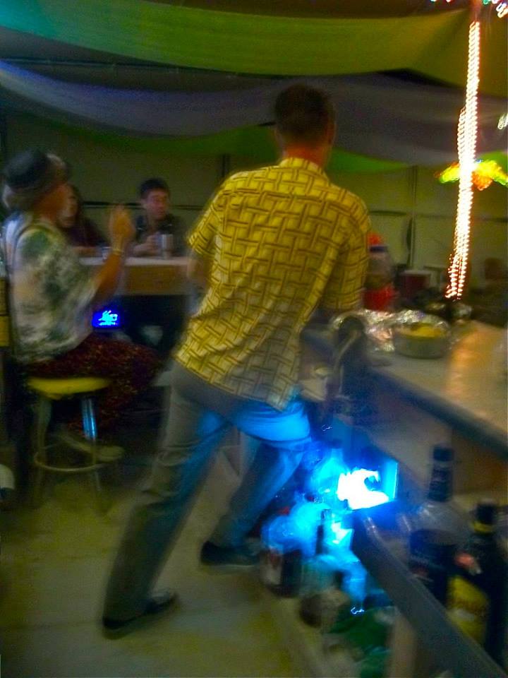 We watched the burning of the Man with campmates Canyon and Damien from atop our parked art car that evening. It was lovely to watch from afar, and away from the other 68,000 hippies crowding around the Man. We spent the evening in camp at the bar.