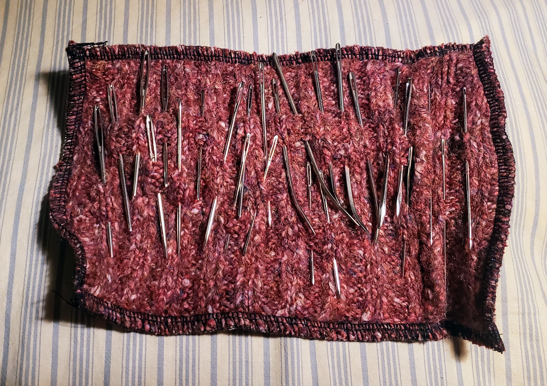- Find a piece of a knit fabric, old sweaters are great. Fleece isn’t ideal as large needles may not easily pierce the fleece. Knit fabrics work best. I used a synthetic knit sweater.