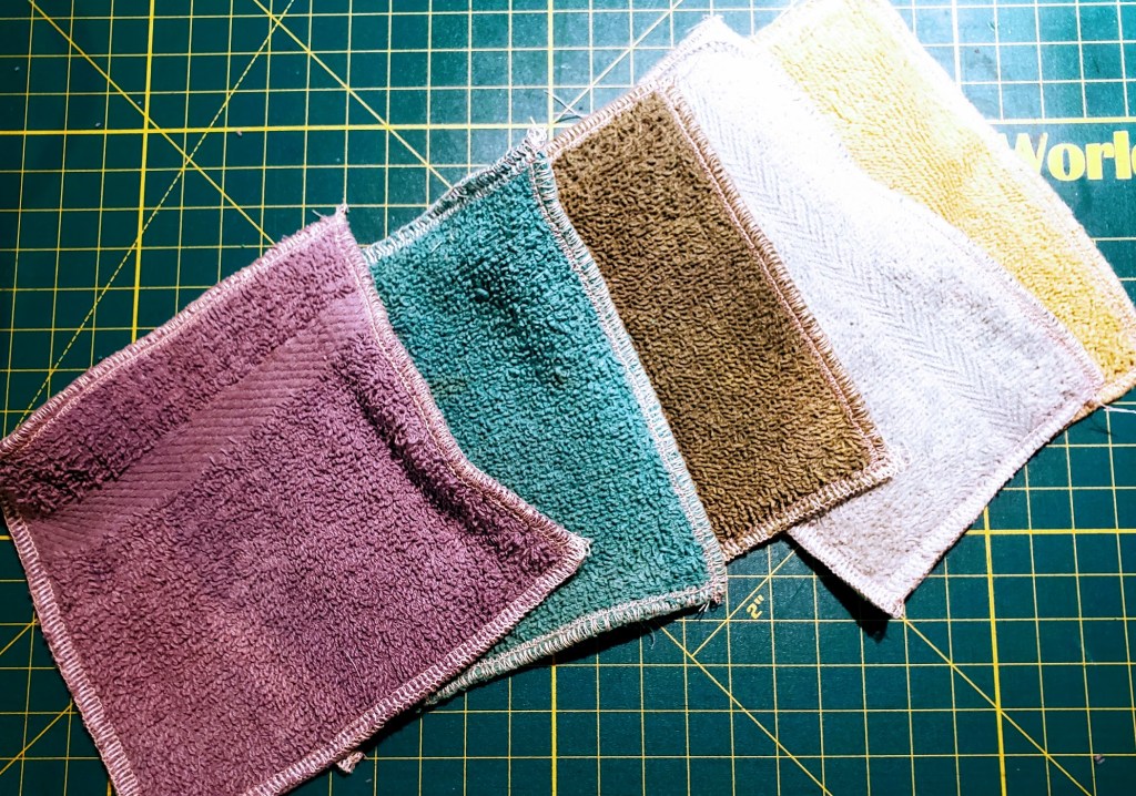 If you dislike stinky non-biodegradable sponges, here an easy way to upcycle old terrycloth towels into reusable sponges. These are great for wiping counters, light cleaning and messy spills. Just toss them in the washing machine with your kitchen towels, and reuse again and again.