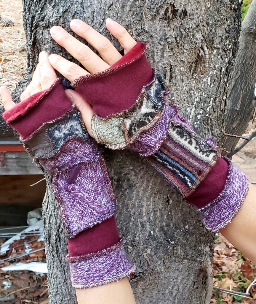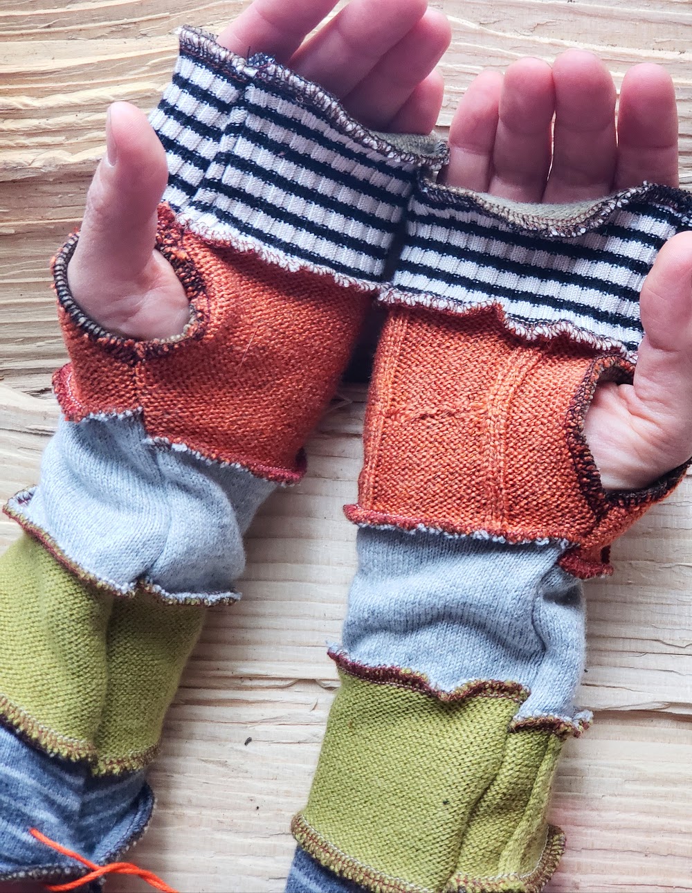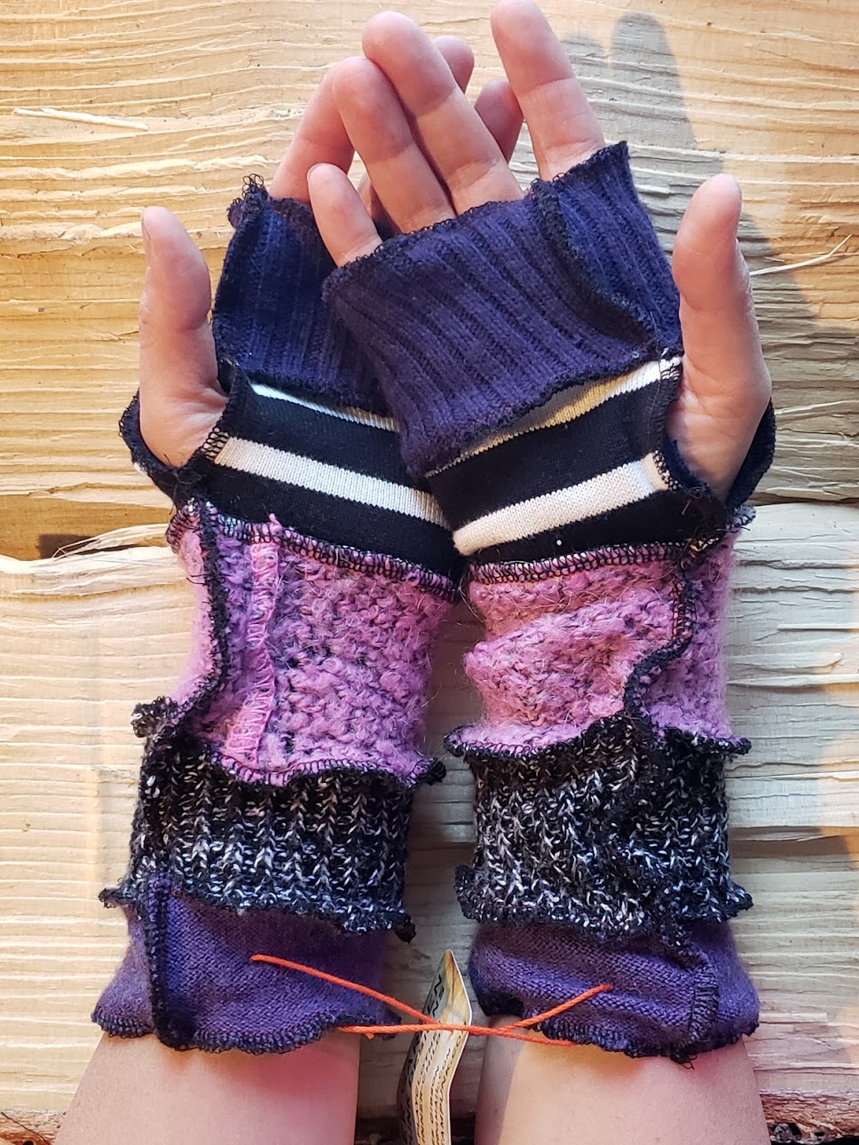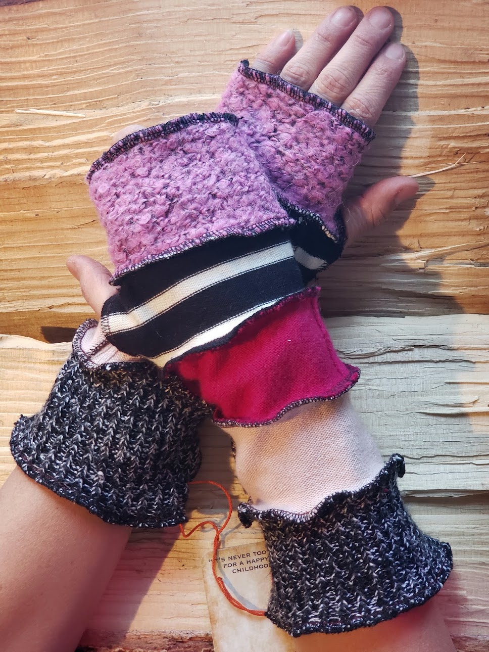 During the fall and winter months, I make Fingerless Hand Sweaters out of pre-owned sweaters and hand-knit scarves. Each pair is one-of-a-kind. Check my Etsy shop.