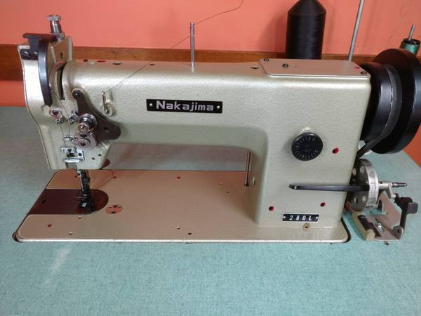 We love our Nakajima machine, made by Juki. We replaced the clutch motor, which was a little too fast and dangerous for learning. She now has a Servo motor which is much smoother and slower. This machine is for heavy duty projects with leather, vinyl, heavy canvas, duck, webbing and upholstery fabrics. It is extremely simple, with just a strait stitch (no zig zag), but does have a reverse and stitch size dial.